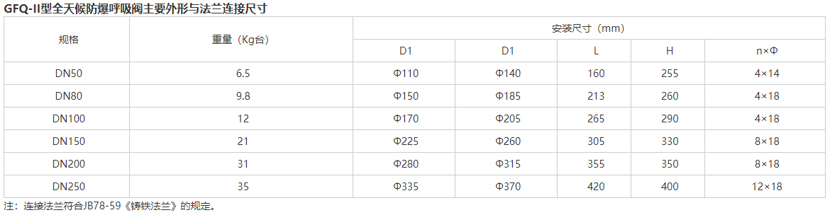 GFQ-II型全天候防爆呼吸閥主要用途 沃茈閥門(上海)有限公司生產(chǎn)銷售的GFQ-II型全天候防爆呼吸閥用于安裝原油、汽油、煤油、輕柴油、芳烴等固定頂式儲罐上的主要安全設(shè)備,是起蒸發(fā)損耗與保護(hù)儲罐在受超壓或真空時免遭破壞的作用。此閥通常與阻火器配套使用。 GFQ-II型全天候防爆呼吸閥主要特點 本閥具有通風(fēng)量大,密封性能好,泄漏量小,耐腐蝕等特點。